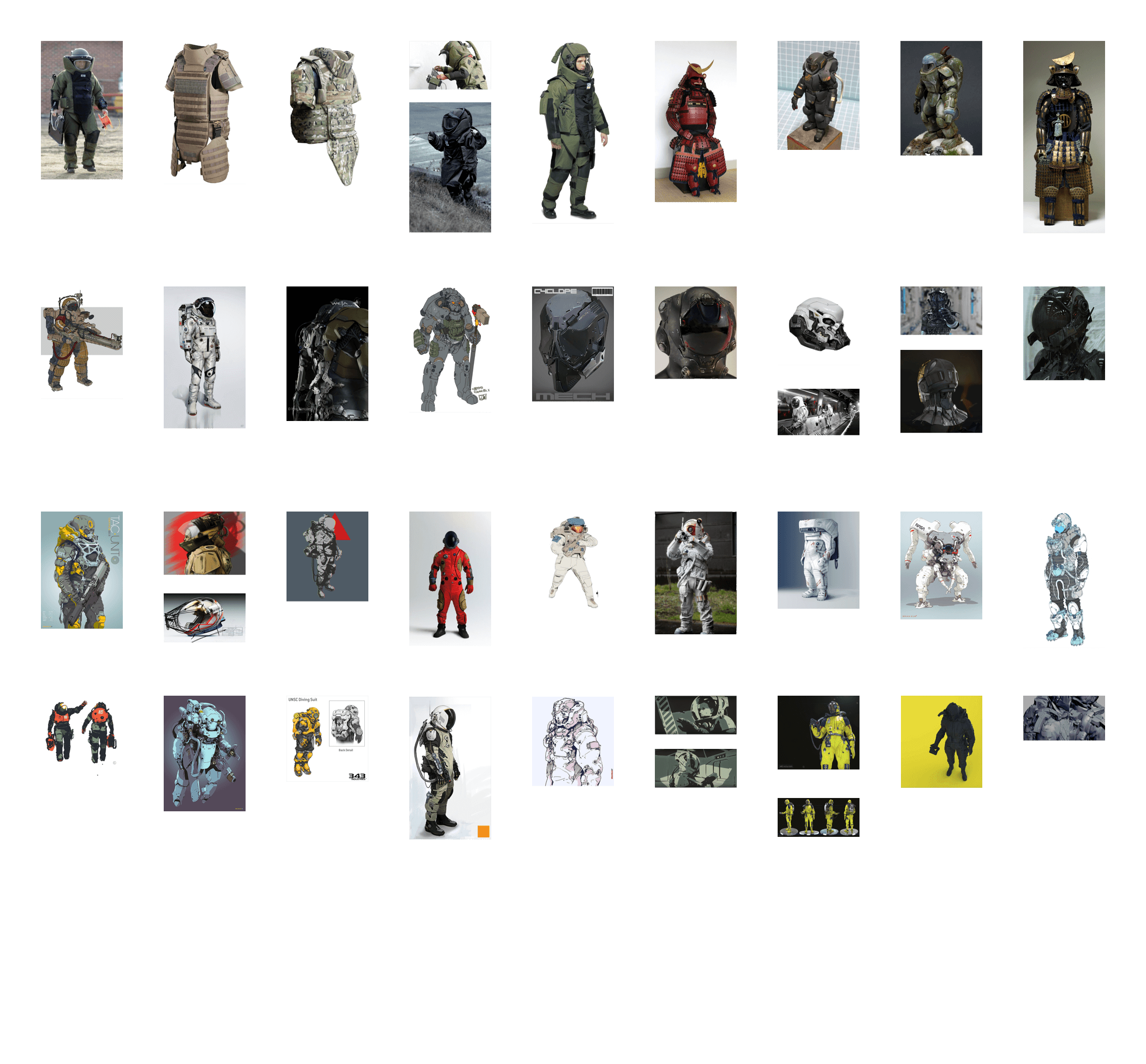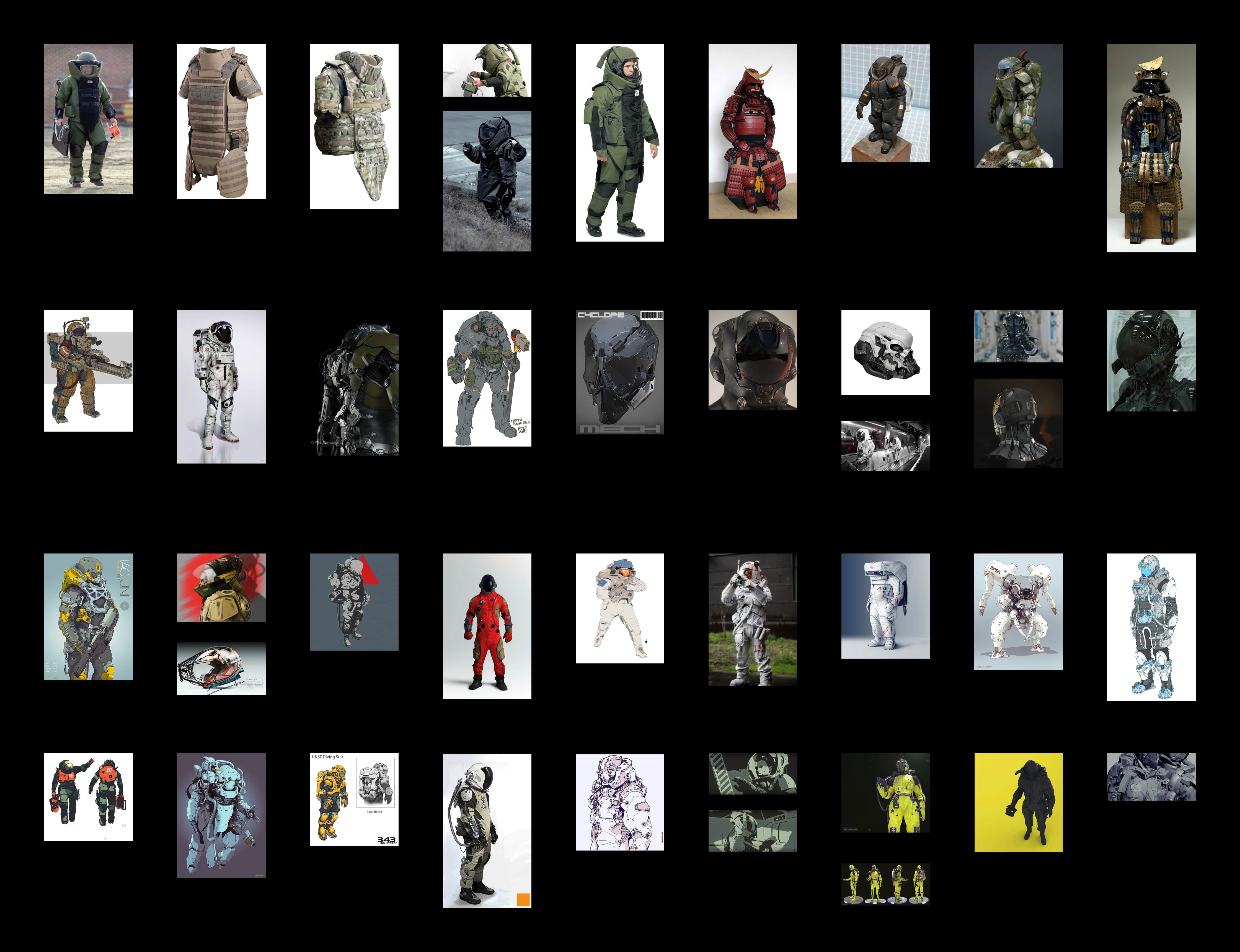 ↪︎We wanted to create a design that communicated the space suit’s functionality (within the limits of cinematic convention, of course). A form that could speak to the physical materials and manufacturing methods of the suit. These were our references: divers, sappers (who have the heaviest-duty protection) and traditional space suits. We now needed to find the sweet spot between the three.