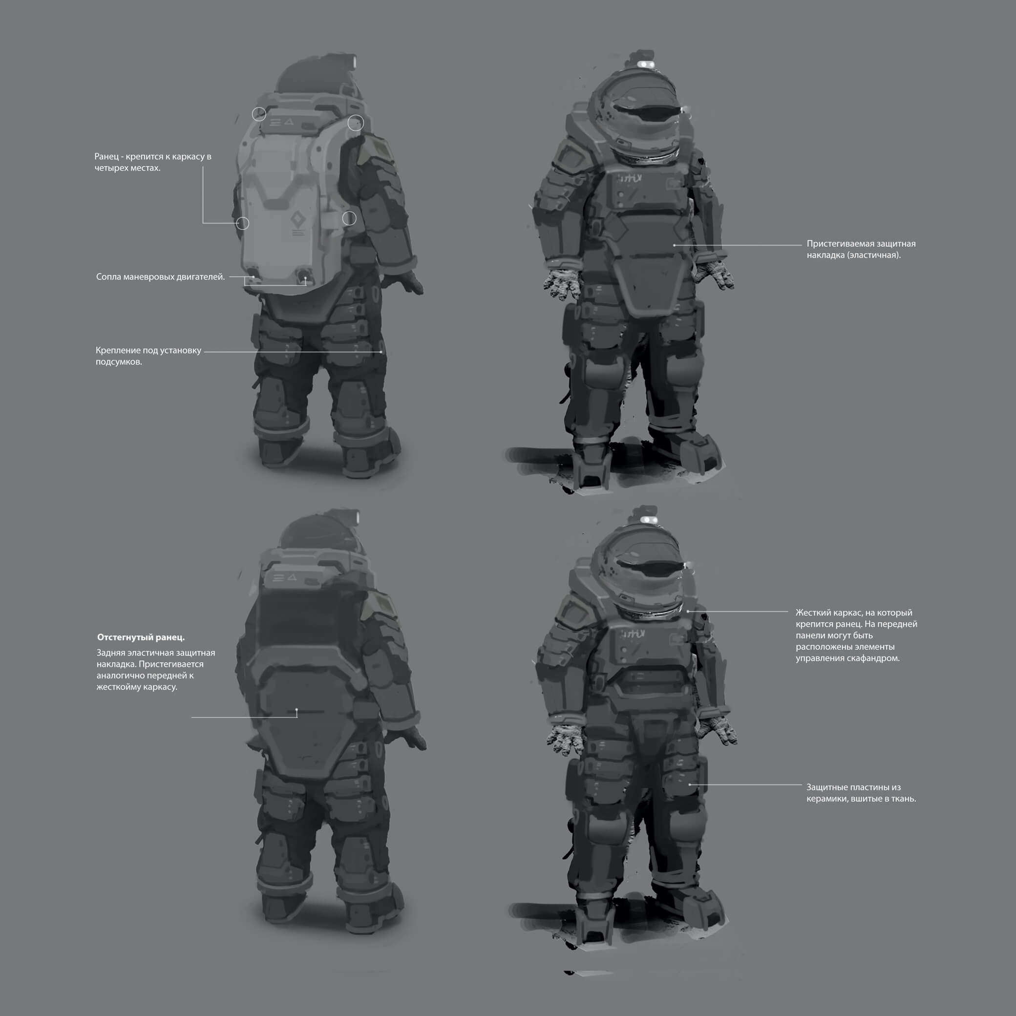 ↪︎Based on the description from the book our space suit should look like a “normal” modern one, but with an extra layer of protection that makes it bulky and heavy.