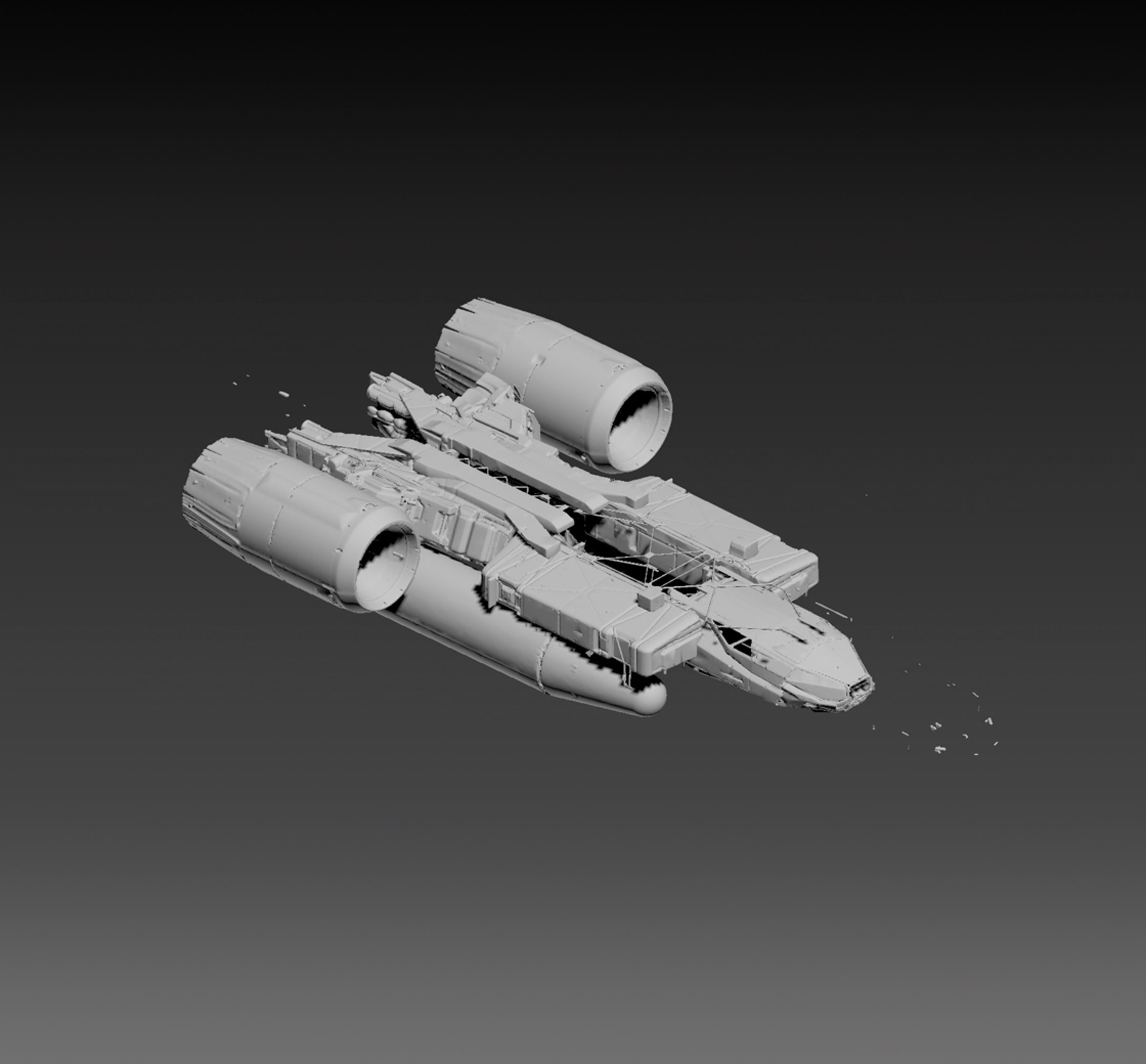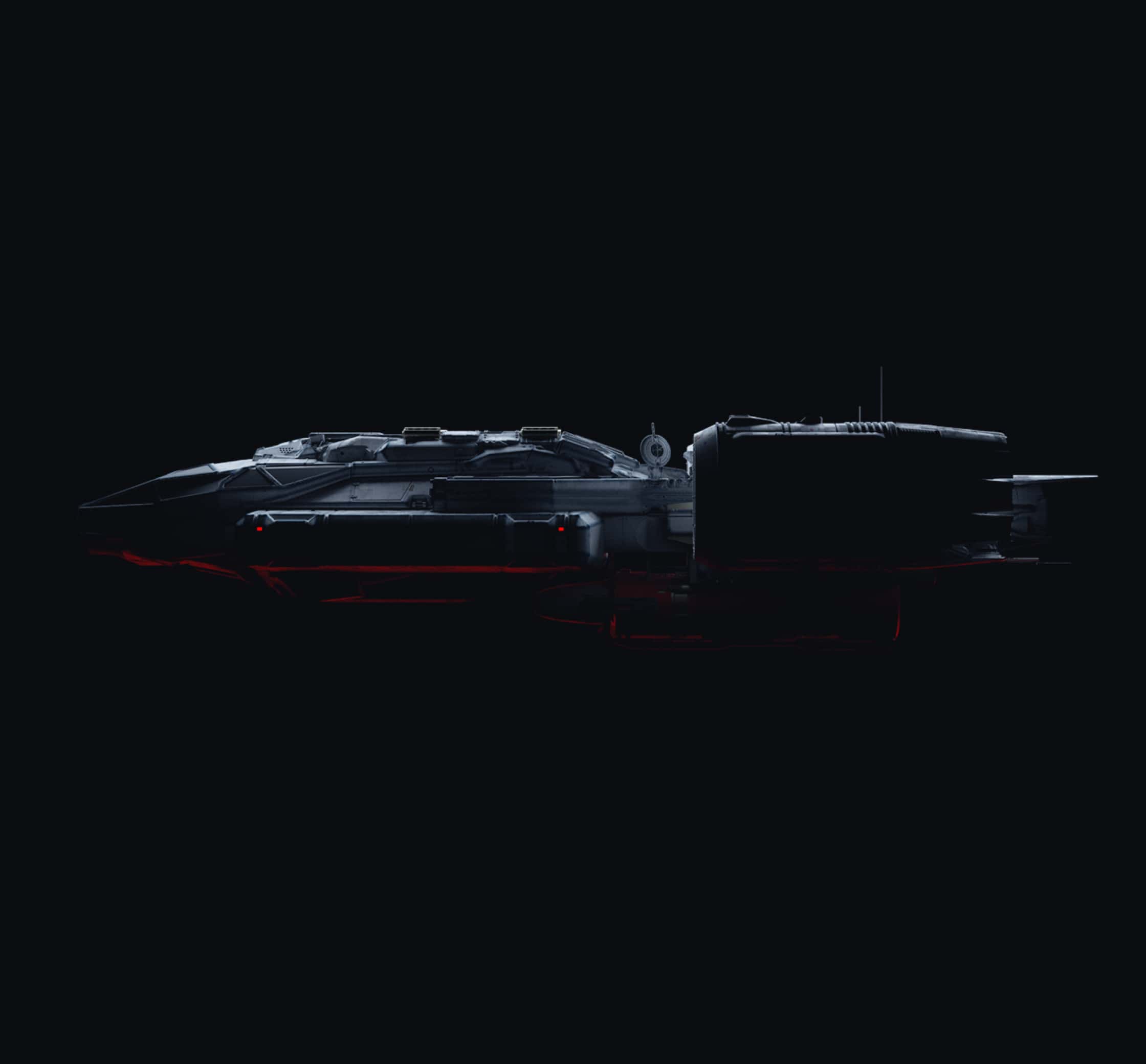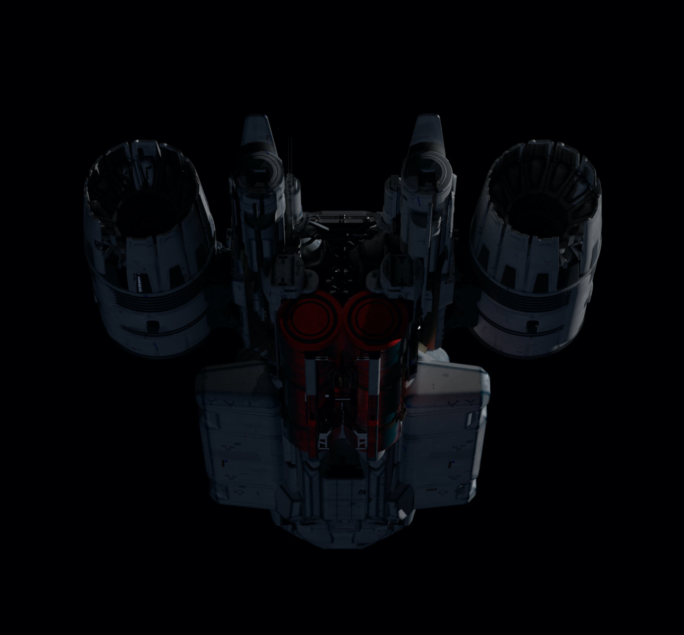 ↪︎Within our team, we ended up calling this asset “frankenshuttle”. The ship model ended up changing hands several times before reaching its final look—too much work was required for just one modeler. One of us would start working on the asset, and then be forced to hand off the work do to other, commercial projects piling up. So the frankenshuttle kept getting passed around between team members.