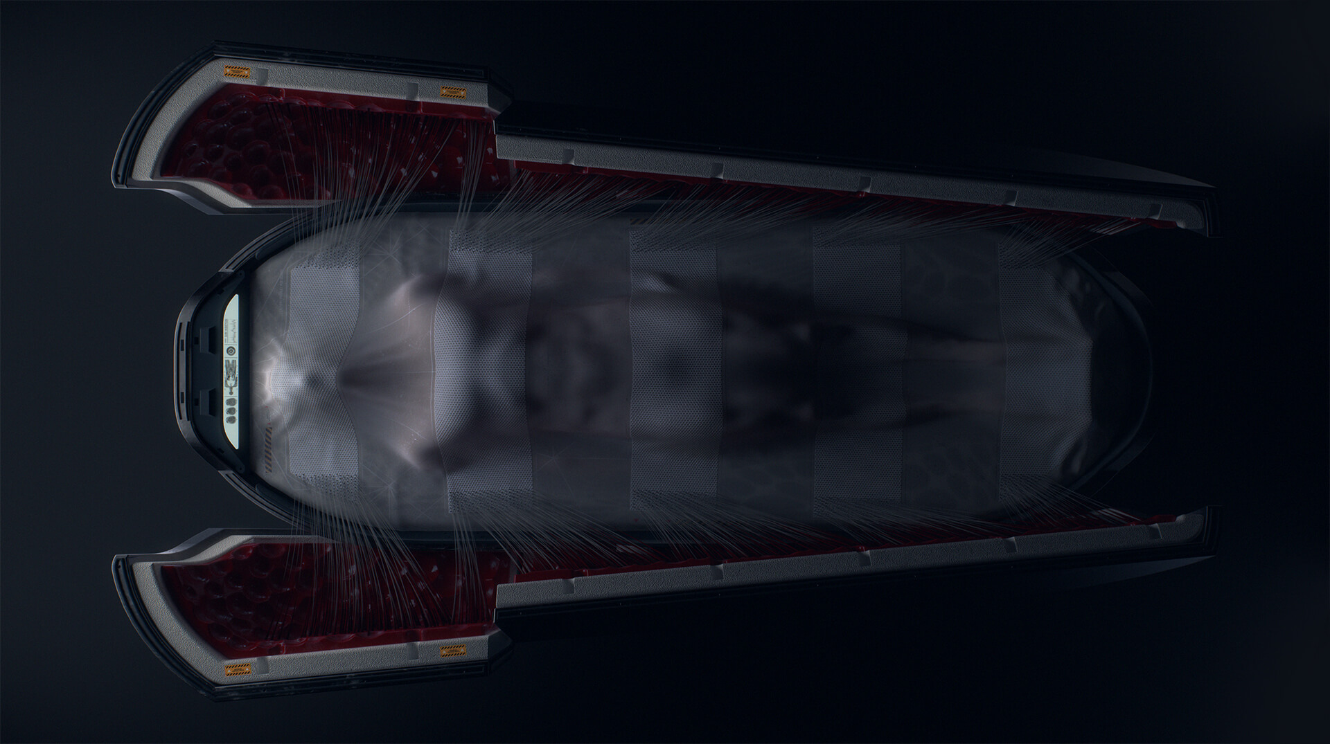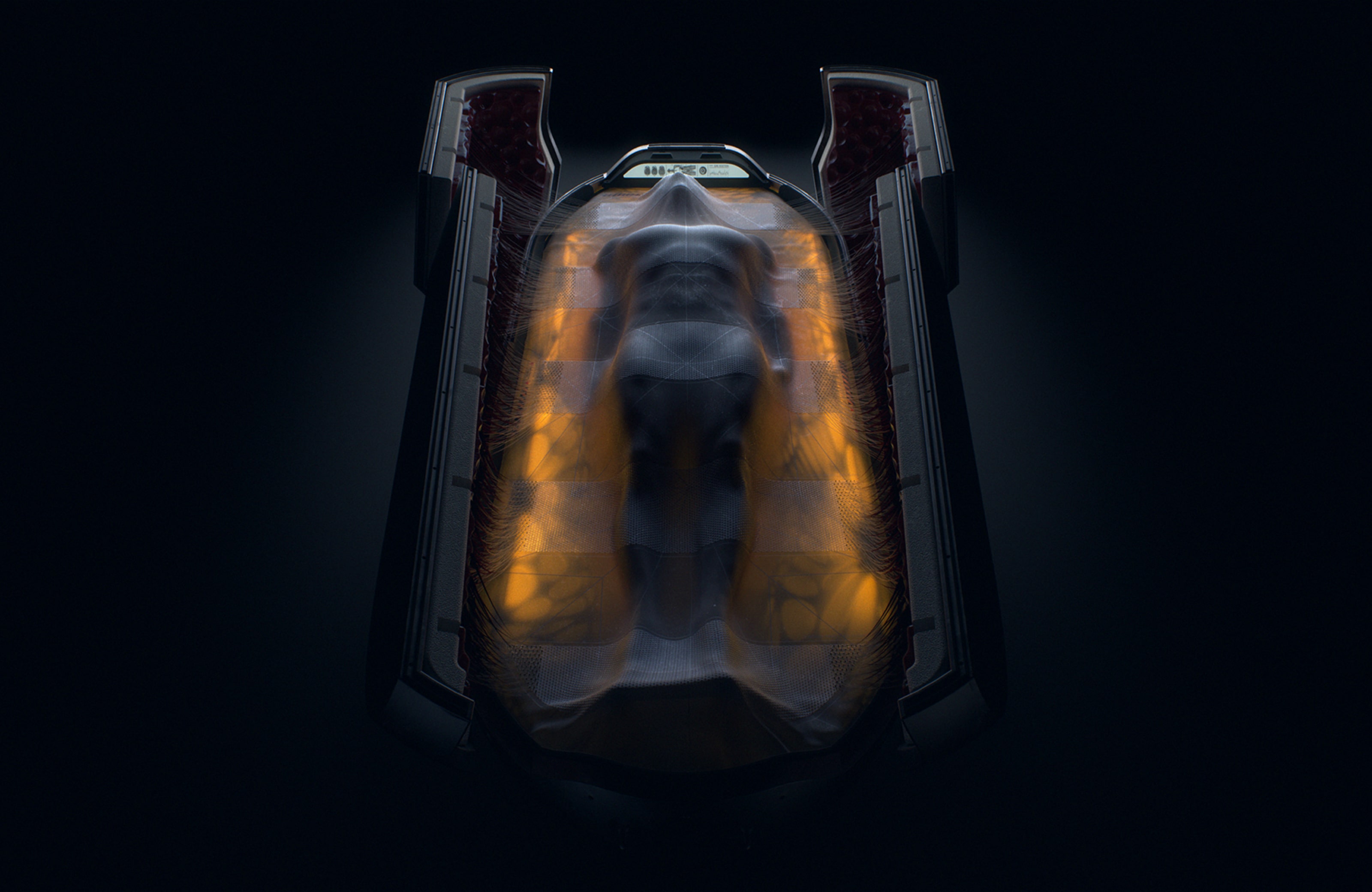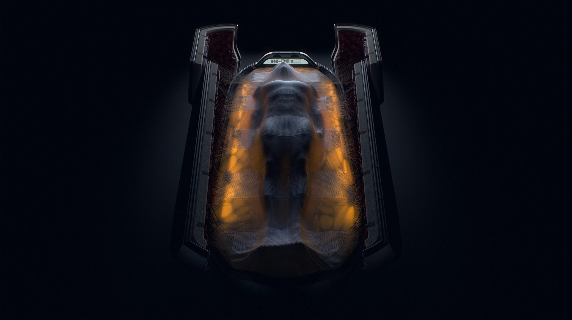 We decided to design our pods based on that idea — that's where the body being fully covered with a piece of cloth comes from. And the overall contrast of the clean mechanical design of the outer shell with the almost organic inside parts is supposed to support the concept of "dead on the outside/ alive on the inside".