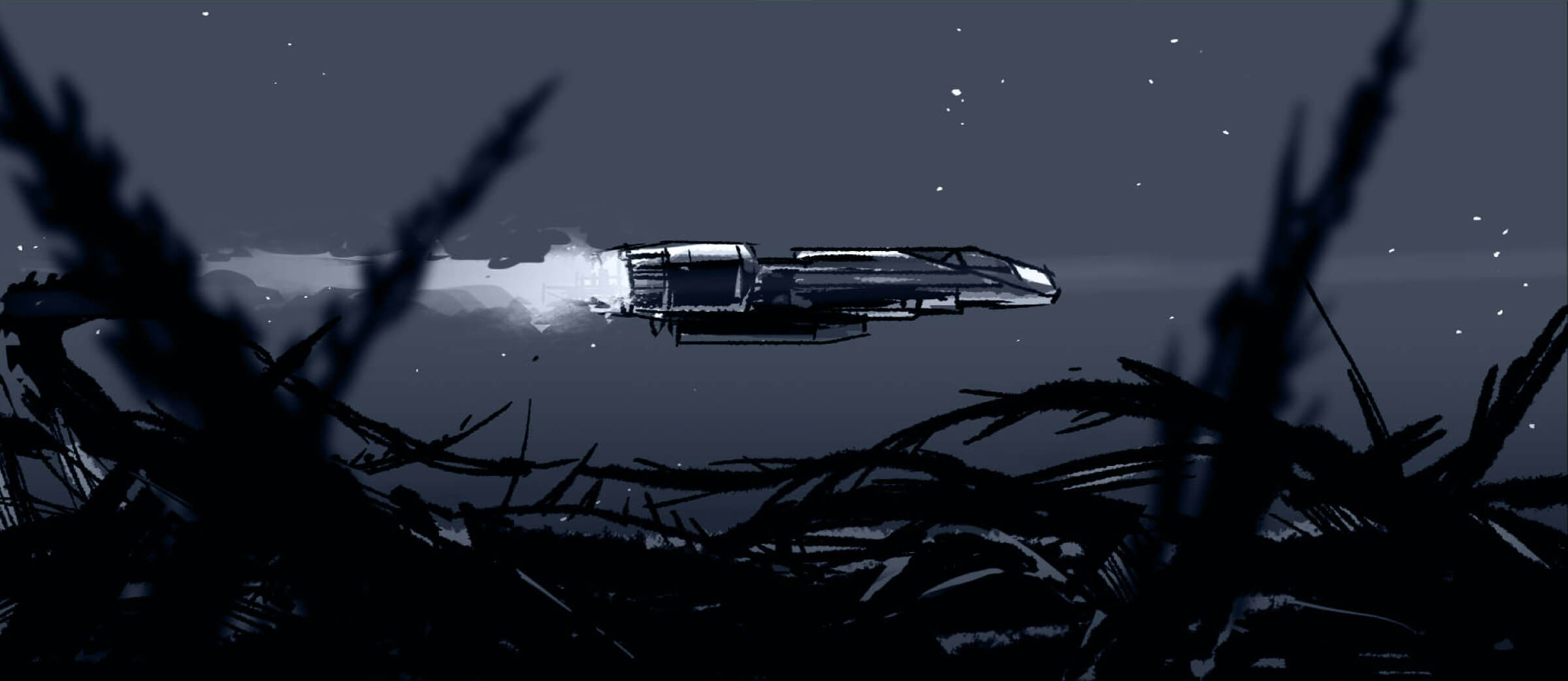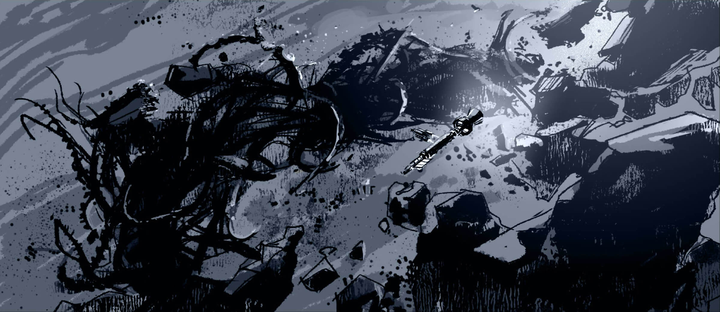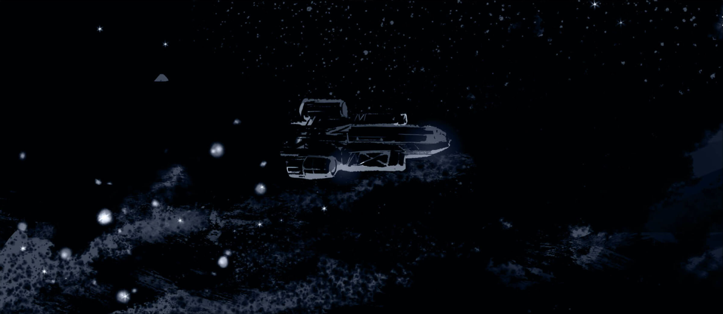 ↪︎Eventually I landed on the idea of making a mini-short based on the protagonist Siri’s memories and voice-over narration. The entire novel is Siri’s retelling of the events that took place at first contact with a member of an extraterrestrial civilization, so this seemed like a good framework for our short. We chose around 40 key scenes from the book (omitting dialogue) and then whittled the short-list down to 20.