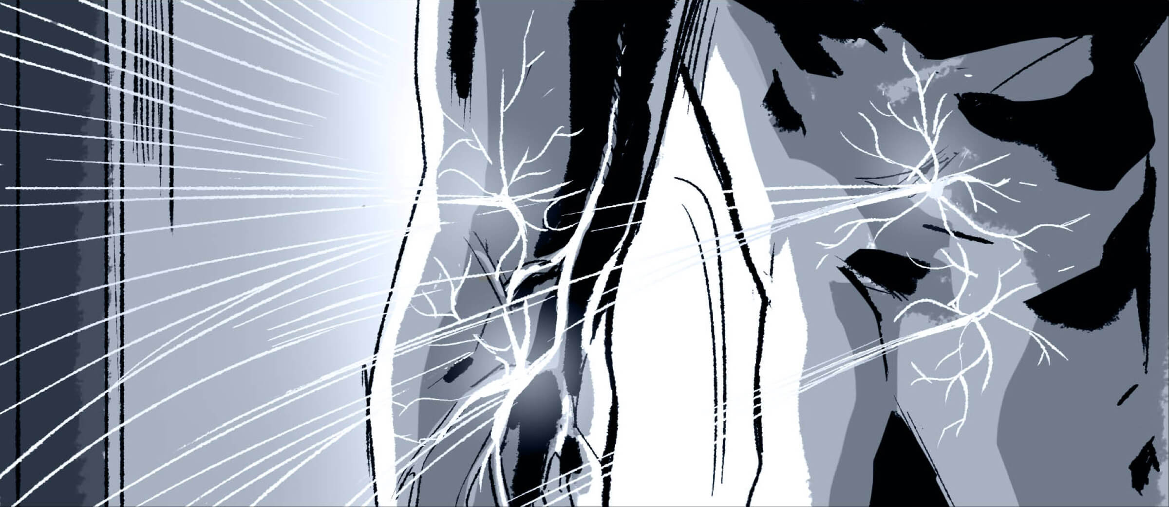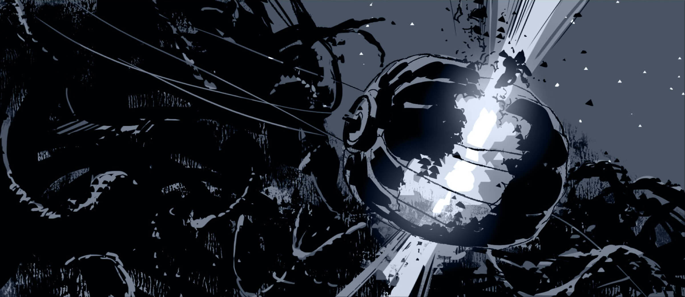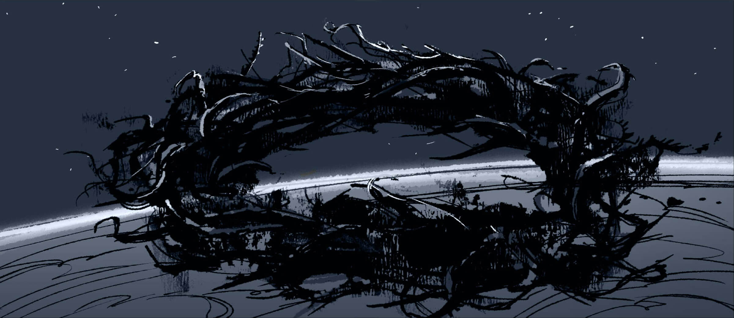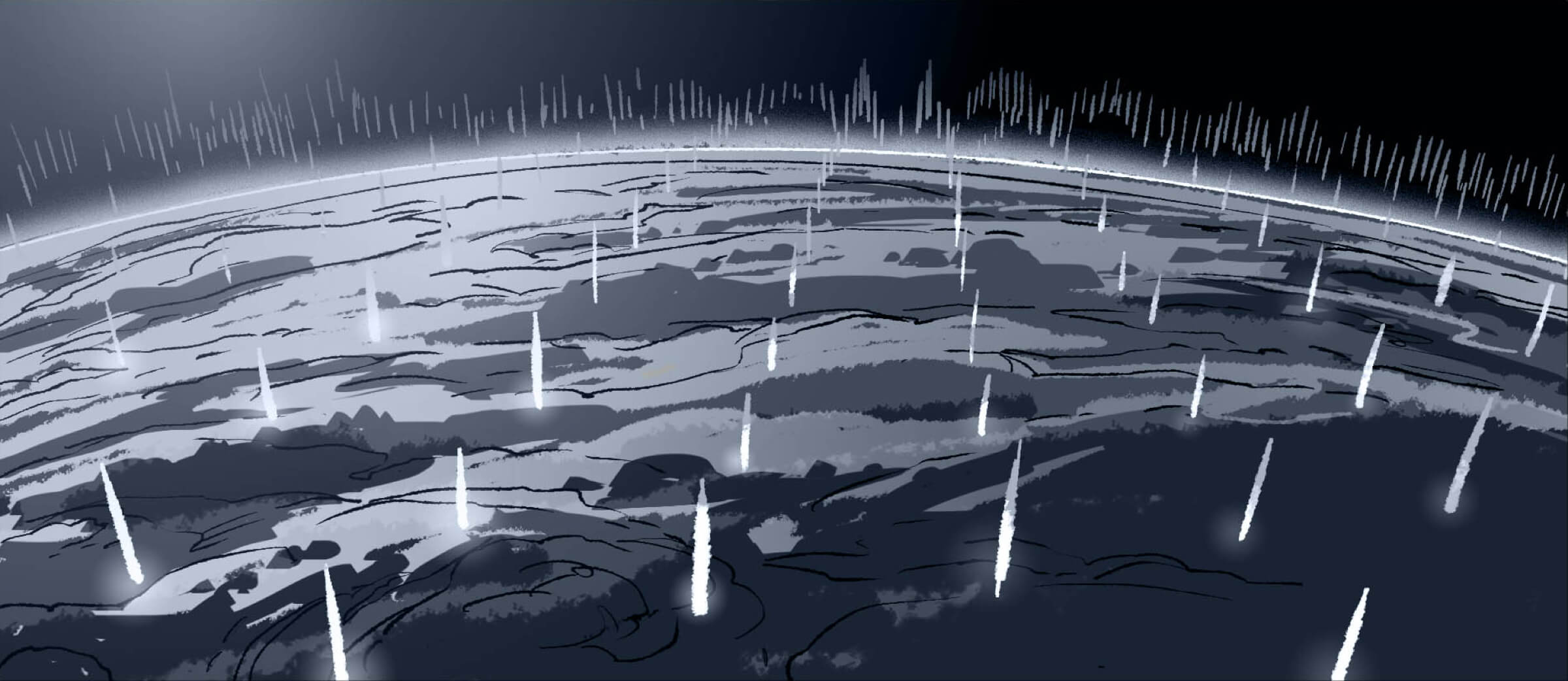 ↪︎Eventually I landed on the idea of making a mini-short based on the protagonist Siri’s memories and voice-over narration. The entire novel is Siri’s retelling of the events that took place at first contact with a member of an extraterrestrial civilization, so this seemed like a good framework for our short. We chose around 40 key scenes from the book (omitting dialogue) and then whittled the short-list down to 20.