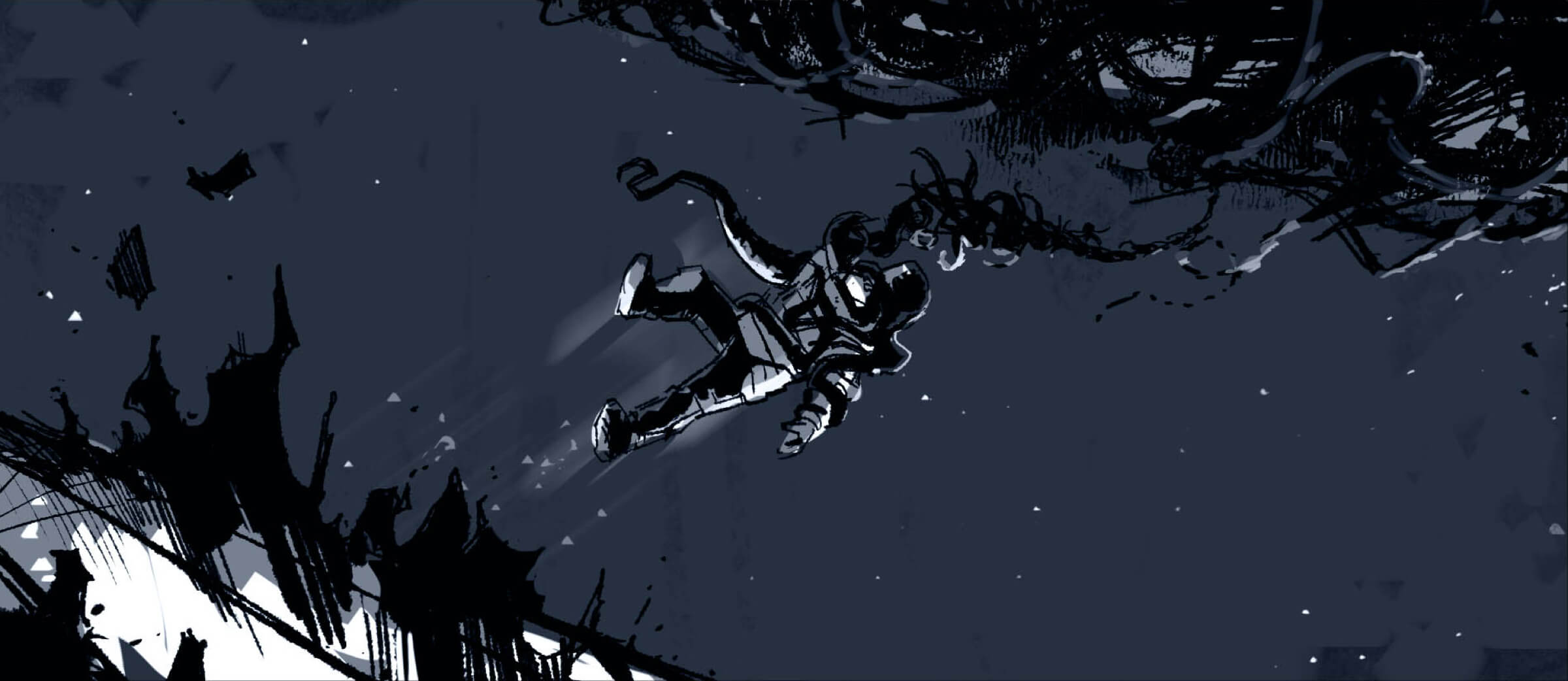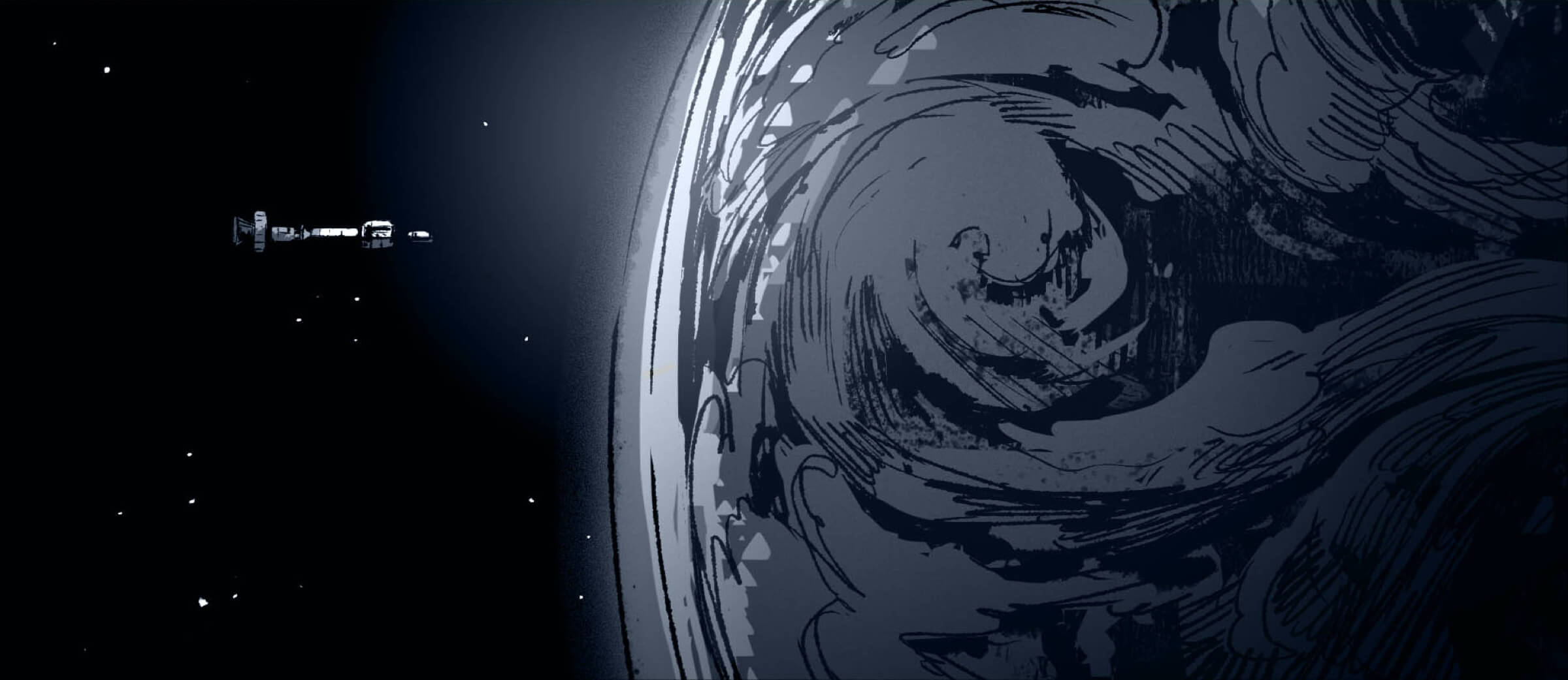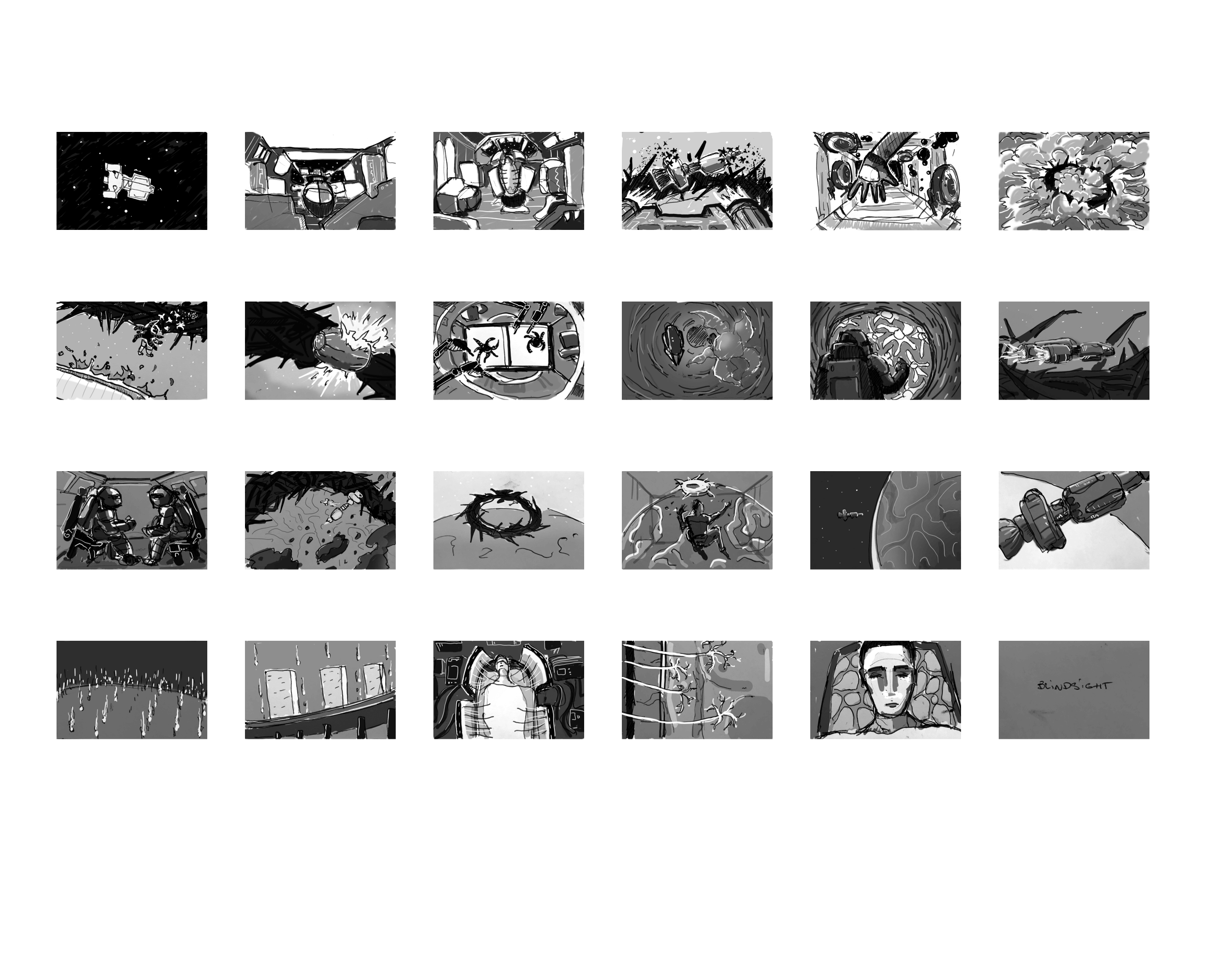 ↪︎After that the overarching structure of the story became clearer - we were going to begin and end on the hero waking from cryo-sleep. In between these framing scenes, we would focus on his memories, which were going to be shown in reverse order - starting with the final battle between Theseus and Rorschach and ending on the first appearance of the Fireflies in the sky of the Earth, the moment when humanity discovered that we are not alone in this universe.