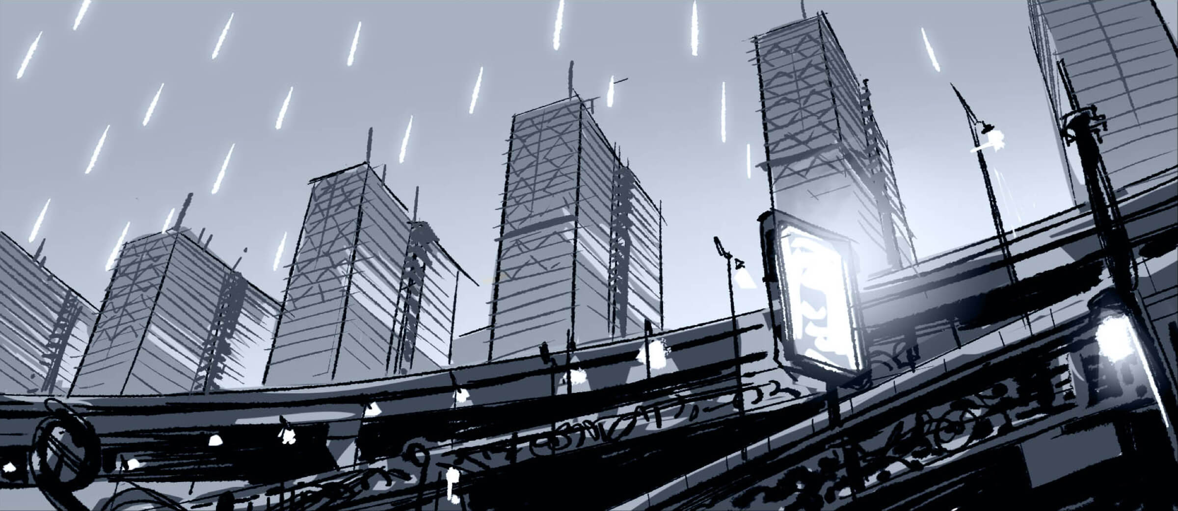 ↪︎I began by simply creating a few style-frames and then gradually moving on to animation tests. At a certain point it began seeming as though there might be enough resources to create something beyond just a series of shots. But at the same time, since there was zero financial backing, it was clear that a short with realistic characters, dialogue and a full script was out of the question.